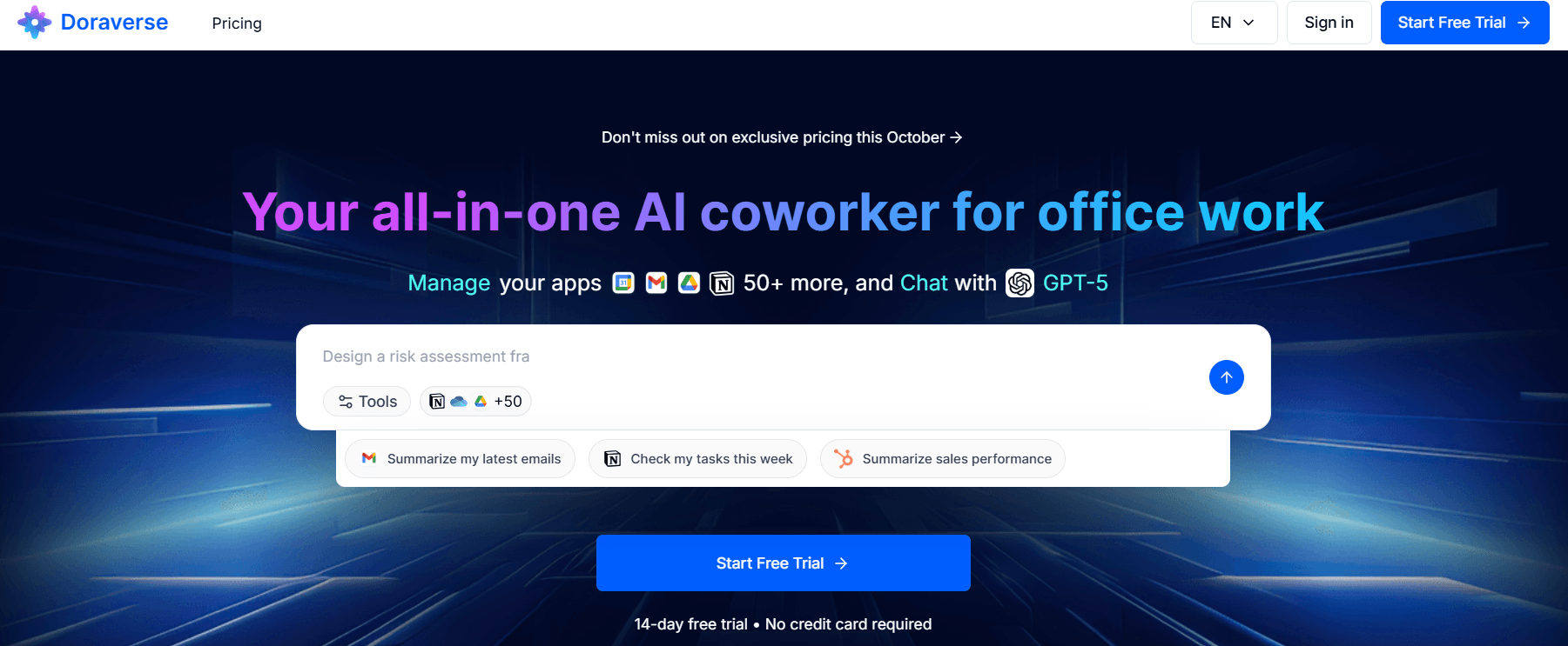 Doraverse, ofis işlerinin tamamını tek bir çatı altında toplayan yapay zeka destekli çalışma alanı olarak konumlanıyor. Platform, kullanıcıların e-posta, belge, toplantı, görev ve iletişim akışlarını tek sekmede birleştiriyor ve 15’ten fazla model ile 50’den fazla uygulama entegrasyonunu aynı arayüzde buluşturuyor. Gmail, Google Drive, Notion, Slack ve Google Calendar gibi araçlardan gelen veriler tek yerde sorgulanıyor, böylece son satış performansını özetle gibi istekler anında çalıştırılıyor ve uygulamalar arasında sürekli geçiş yapma ihtiyacı ortadan kalkıyor.