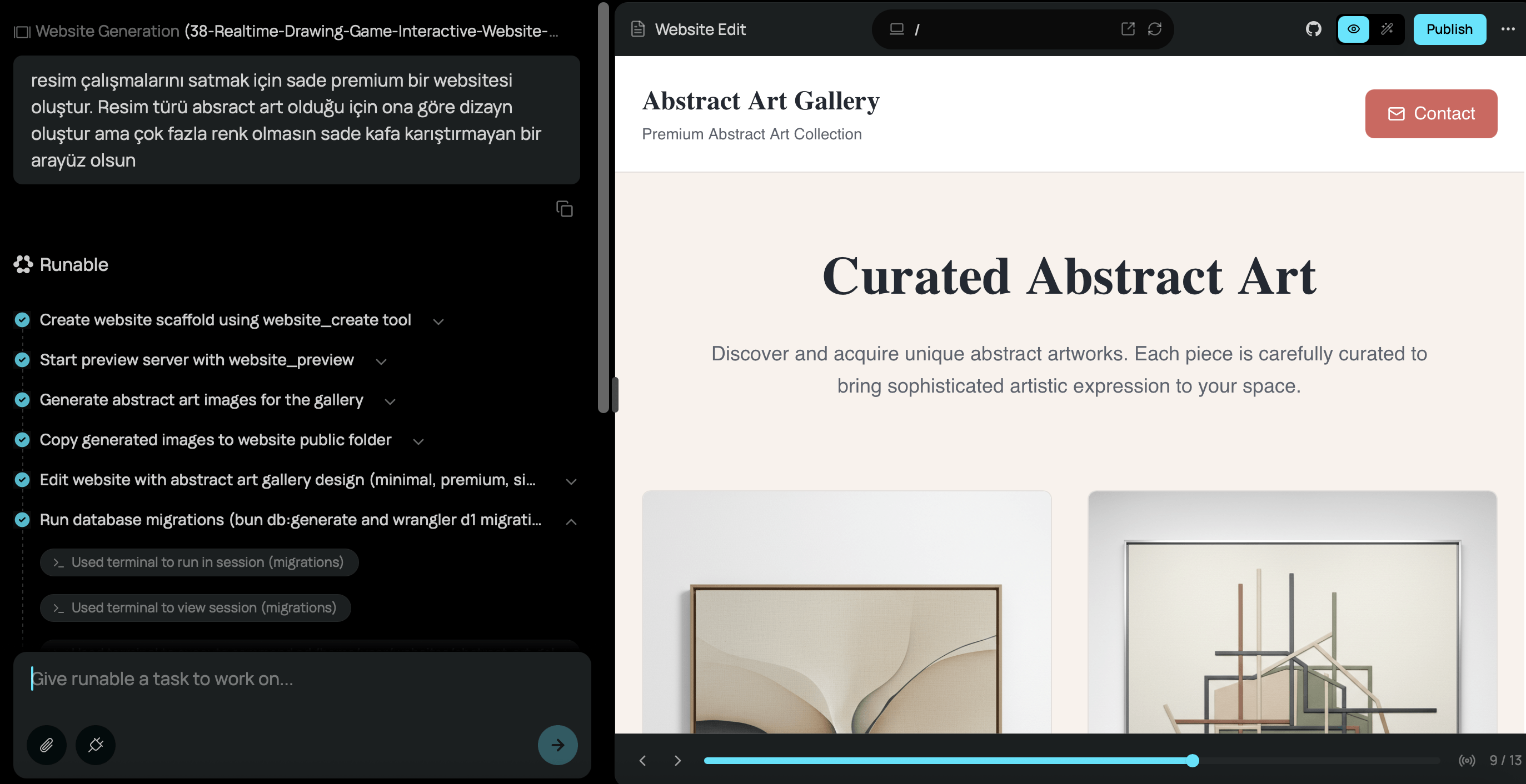 Arayüz tarafında Runable, modüler bir yapı benimsiyor. AI Slides, AI Website, AI Report, AI Document, AI Podcast, AI Image ve AI Video modülleri ile içerik üretimi süreçlerini uçtan uca yönetiyor. Platform, slayt ve web tarafında tam yığın site oluşturucu, Stripe entegrasyonu, veritabanı entegrasyonu ve 500’den fazla site ile fikir oluşturmayı kolaylaştıran bir şablon kütüphanesiyle öne çıkıyor.