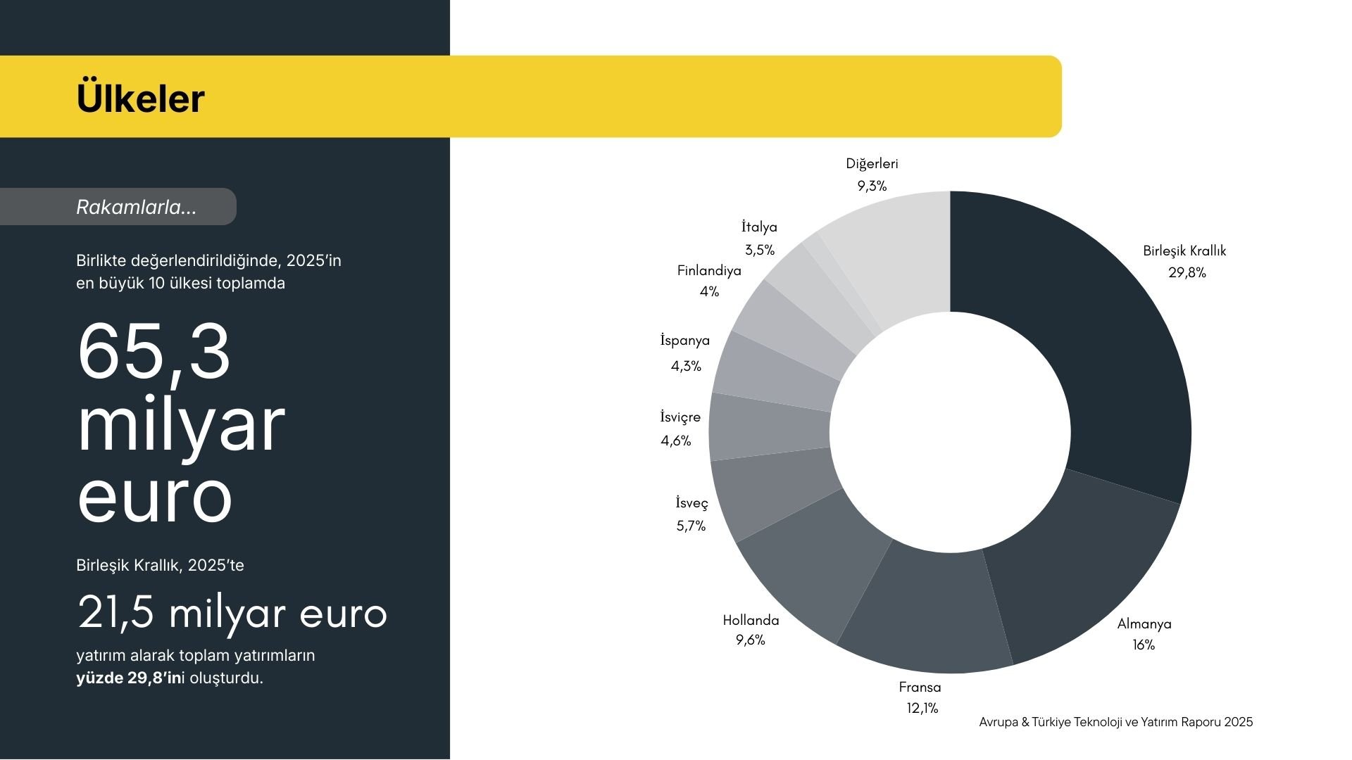 Bu ülkeler arasında Birleşik Krallık, 21,5 milyar euro ile ilk sırada yer alarak toplam yatırımların yüzde 29,8’ini oluşturdu. Birleşik Krallık'ı Almanya (yüzde 16) ve Fransa (yüzde 12,1) izlerken, Hollanda (yüzde 9,6), İsveç (yüzde 5,7) ve İsviçre (yüzde 4,6) gibi pazarlar da Avrupa teknoloji sermayesinde önemli paylara sahip olmaya devam etti.
