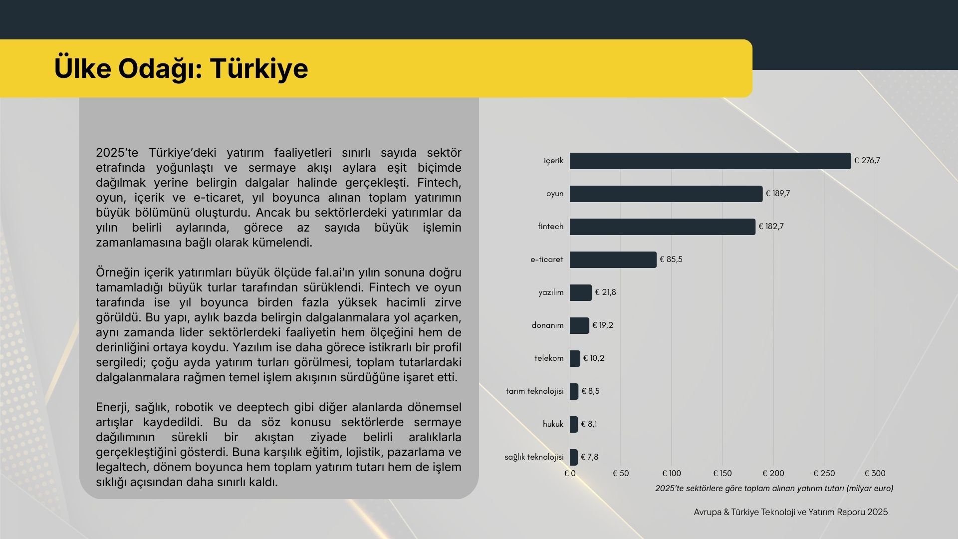 Sektörler bazında bakıldığında, içerik tarafında 276,7 milyon euro, oyunda 189,7 milyon euro ve fintech tarafında 182,7 milyon euro seviyeleri öne çıktı. İçerik yatırımları büyük ölçüde fal.ai’ın yılın sonuna doğru tamamladığı büyük turlar tarafından sürüklendi. Fintech ve oyun tarafında ise yıl boyunca birden fazla yüksek hacimli zirve görüldü. Buna karşılık yazılım, daha görece istikrarlı bir profil sergilerken; enerji, sağlık, robotik ve deeptech gibi alanlarda dönemsel artışlar dikkat çekti.