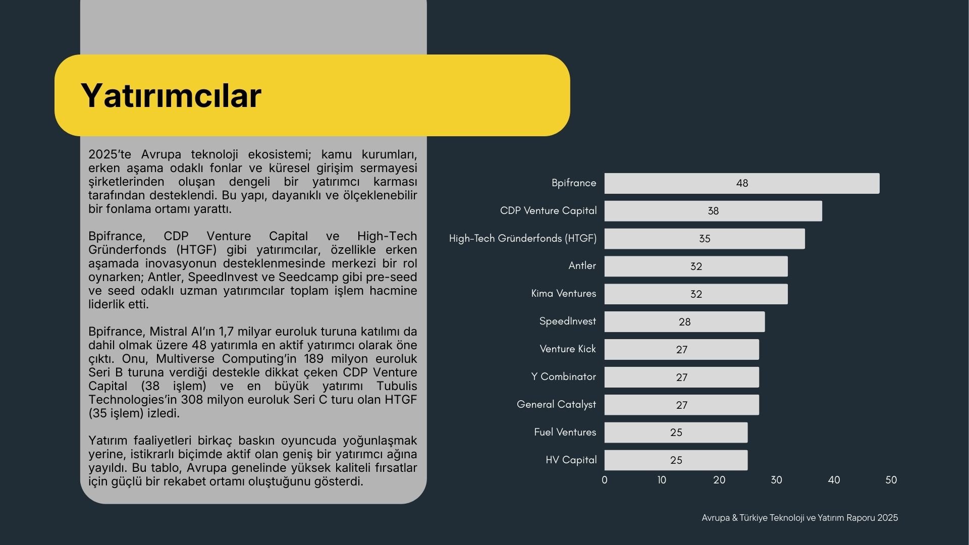 İşlem sayısına göre bakıldığında, Bpifrance 48 yatırımla yılın en aktif yatırımcısı olurken, onu CDP Venture Capital (38 işlem) ve High-Tech Gründerfonds - HTGF (35 işlem) izledi. Antler, Kima Ventures, SpeedInvest ve Seedcamp gibi pre-seed ve seed odaklı fonların üst sıralarda yer alması, erken aşama yatırımların 2025 boyunca Avrupa genelinde canlılığını koruduğuna işaret etti.