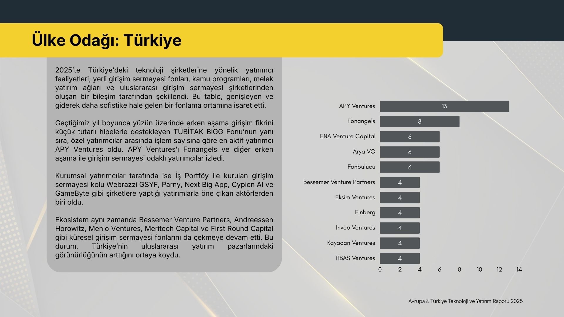 Özel yatırımcılar tarafında, işlem sayısına göre APY Ventures öne çıkarken, onu Fonangels, ENA Venture Capital, Arya VC ve Fonbulucu izledi. Erken aşama odaklı fonların üst sıralarda yer alması, 2025 boyunca Türkiye'de pre-seed ve seed aşamasında yatırım iştahının güçlü kaldığını ortaya koydu.