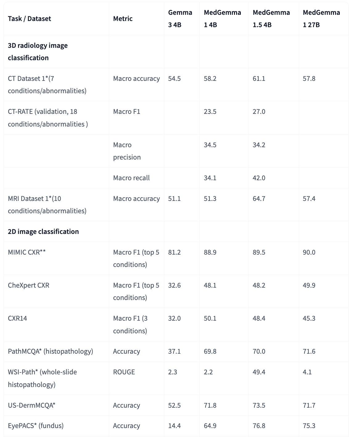 Bazı ölçütlerde MedGemma 1.5 4B'nin, genel amaçlı model Gemma 3 4B ve önceki nesil model MedGemma 1 4B'den daha yüksek puanlar elde ettiği görülüyor. Bazı testlerde ise model, daha büyük olan MedGemma 1.27B'yi bile geride bırakmasıyla dikkat çekiyor.