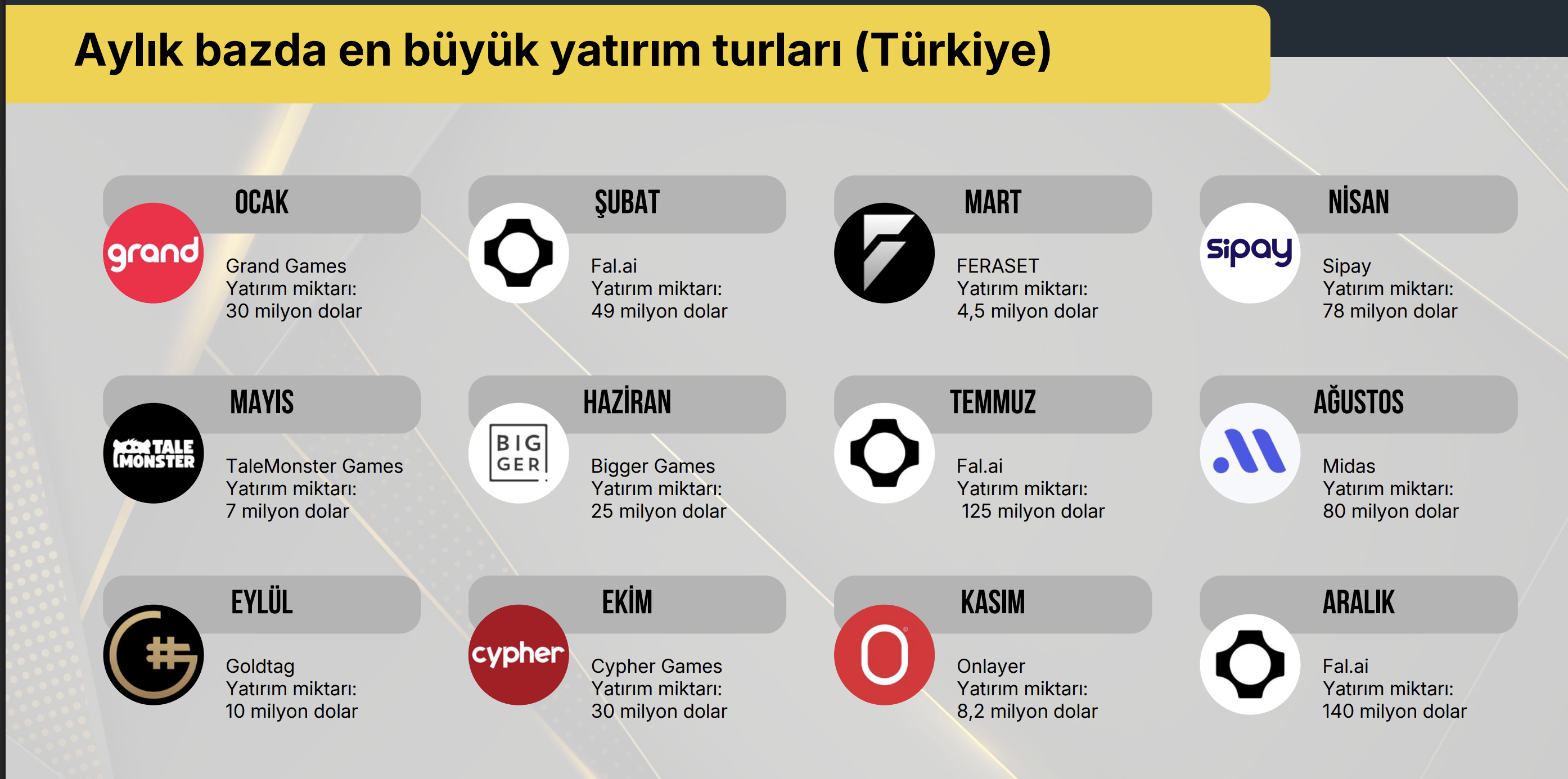 Hepsiburada, Midas ve Sipay gibi büyük ölçekli şirketlerin işlemleriyle birlikte, Good Job Games, Grand Games, Cypher Games ve Bigger Games gibi oyun stüdyolarının turları da listenin önemli bölümünü oluşturdu. Good Job Games, Grand Games, Cypher Games ve Bigger Games olmak üzere dört şirket, birlikte 128 milyon euronun üzerinde yatırım aldı. Bu tablo, oyun sektörünün Türkiye’de en istikrarlı şekilde yatırım çeken teknoloji dikeylerinden biri olmayı sürdürdüğünü gösteriyor.