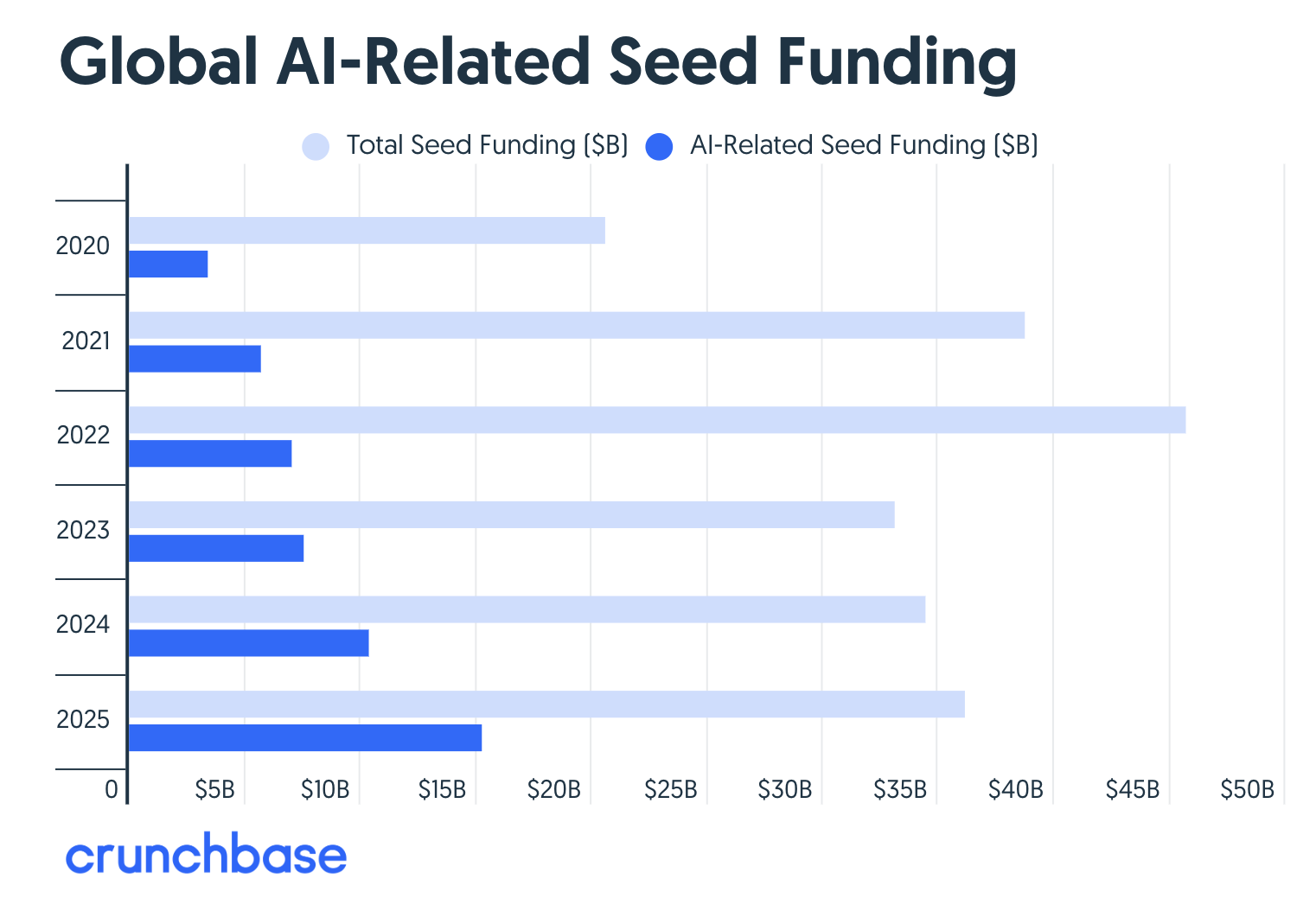 Crunchbase verilerine göre; 2025 yılında küresel tohum yatırımları 38,4 milyar dolara ulaştı. Bu tohum yatırımlarının yüzde 41'inden fazlası ise yapay zeka odaklı sektör kategorilerindeki şirketlere yapıldı. Bu oranın 2024 yılında yüzde 30 olduğunu belirtelim.