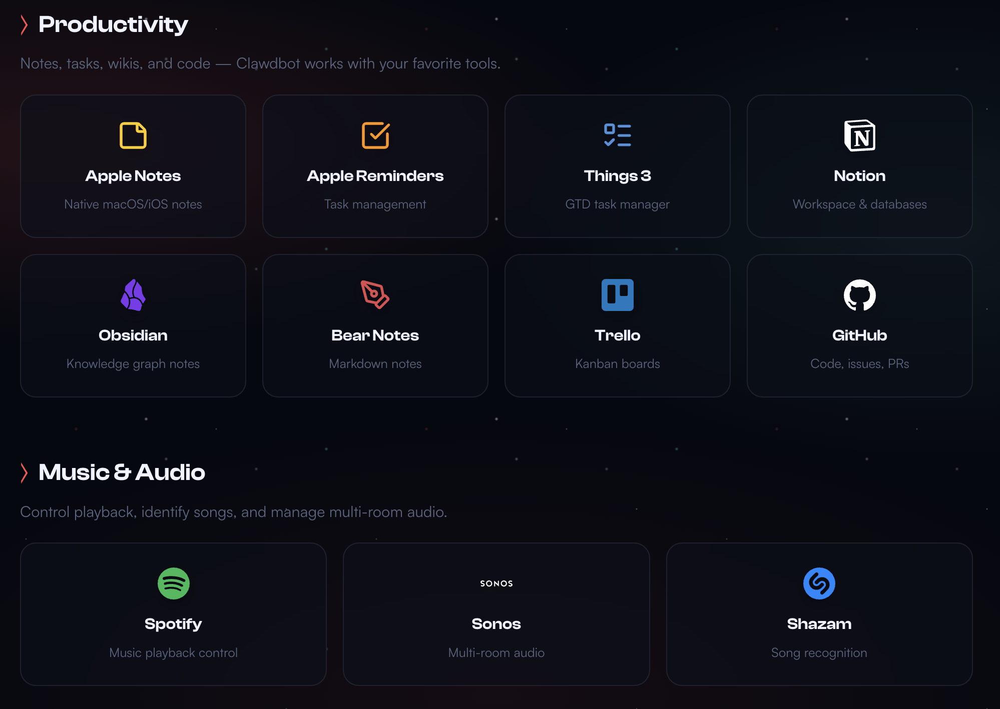 Kullanım örneklerine baktığımızda sabah brifingleri hazırlamadan sağlık takibine, görev otomasyonundan araştırma asistanlığına kadar pek çok seçenek yer aldığını görüyoruz. Ayrıca Clawdbot 50'den fazla uygulama ve hizmetle entegrasyon kuruyor. Clawdbot, akıllı ev ürünleriyle de entegre olabiliyor.