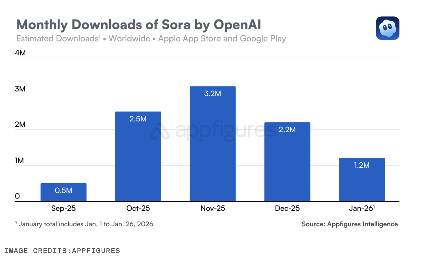 Toplamda Sora’nın uygulaması, iOS ve Android genelinde 9,6 milyon indirmeye ulaştı ve bugüne kadar 1,4 milyon dolar tutarında tüketici harcaması yapıldı. Bu gelirin büyük bölümü ABD’den geliyor (1,1 milyon dolar). ABD’yi sırasıyla Japonya, Kanada, Güney Kore ve Tayland izliyor. Bu ay kullanıcılar Sora uygulamasında 367 bin dolar harcarken bu rakam Aralık ayındaki 540 bin dolarlık zirvenin altında kaldı.