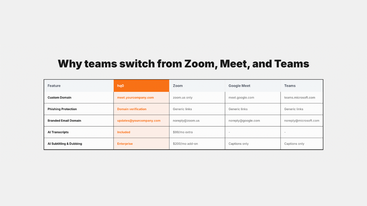 HQ0’nun ürün sayfasında dikkat çeken bölümlerden biri de, platformun Zoom, Google Meet ve Microsoft Teams gibi yaygın kullanılan toplantı araçlarıyla karşılaştırılması. Bu karşılaştırmada HQ0, yalnızca bir toplantı aracı olmanın ötesinde konumlanıyor ve senkron iletişimi şirketin operasyonel bağlamı içine yerleştirmeyi hedefliyor. Zoom, Google Meet ve Teams daha çok toplantı yapmaya odaklanırken, HQ0 toplantıları şirket bilgileri, dokümanlar ve süreçlerle ilişkilendirerek ele alıyor. Amaç, toplantıları izole birer görüşme olarak bırakmak yerine şirket içi operasyonların doğal bir parçası haline getirmek oluyor.