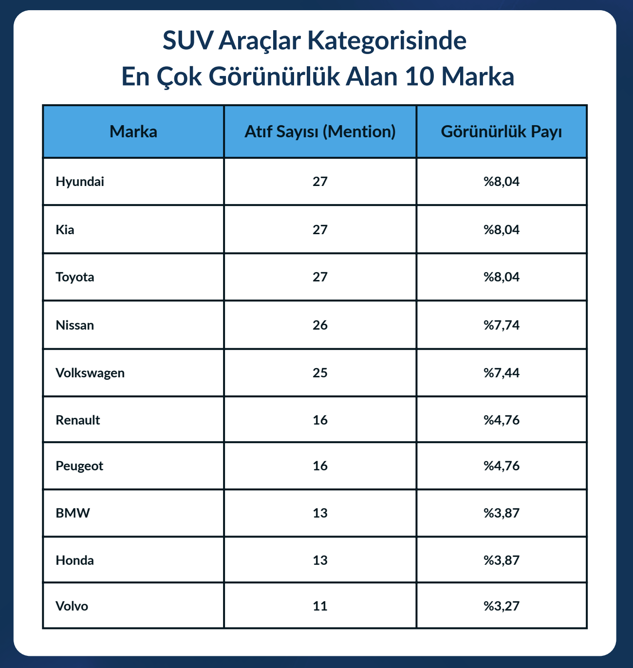 Araştırma sonuçları, yapay zeka platformlarında rekabetin dengeli dağılım gösterdiğini gösteriyor. Markalara bakıldığında, Volkswagen yüzde 7,55 görünürlük payı ile lider konumdayken, bununla beraber yüzde 7,23 ile Renault ve yüzde 7,07 ile Hyundai markalarıyla arasındaki fark sadece yüzde 0,48. Bahsi geçen ilk 3 markanın toplam payı yüzde 21,85 olarak kaydedildi.