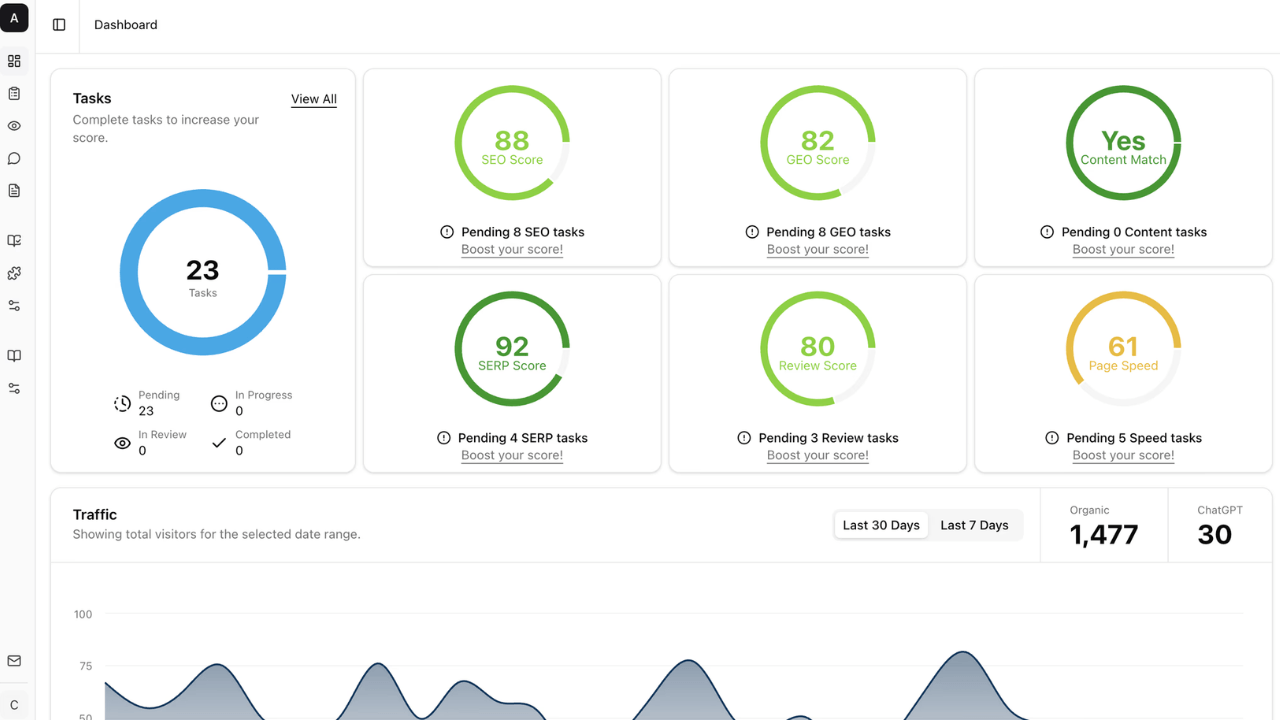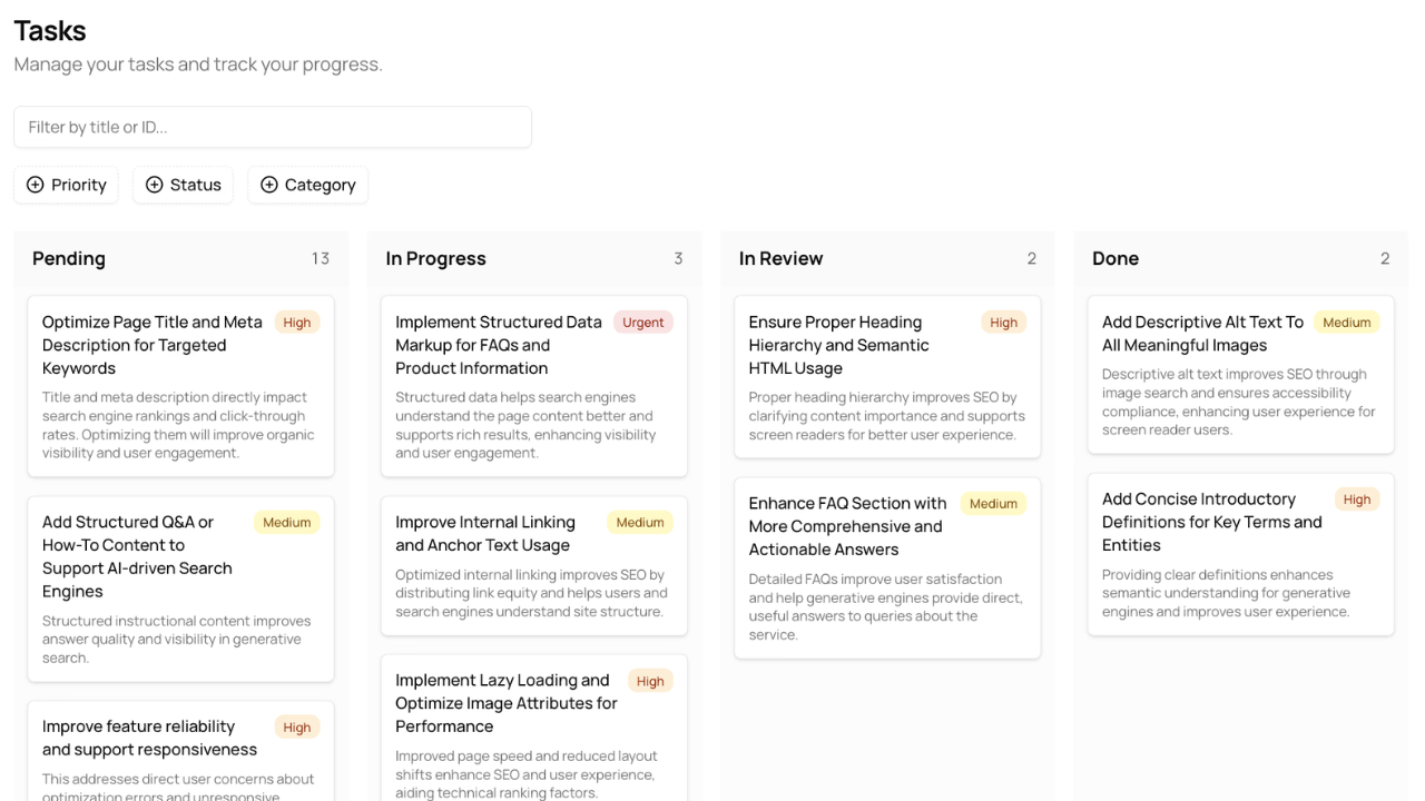 Visby AI botları; markaya ait siteyi tarayarak sitenin LLM botları tarafından daha iyi-kolay taranmasını sağlayacak SEO-GEO görevlerini otomatik üretiyor. Bununla beraber, rakiplerin yüksek alıntı (citation) aldığı markanın görünürlük almadığı konularda içerikleri otomatik üreterek görünürlürlük farklarının kapanmasını sağlıyor.