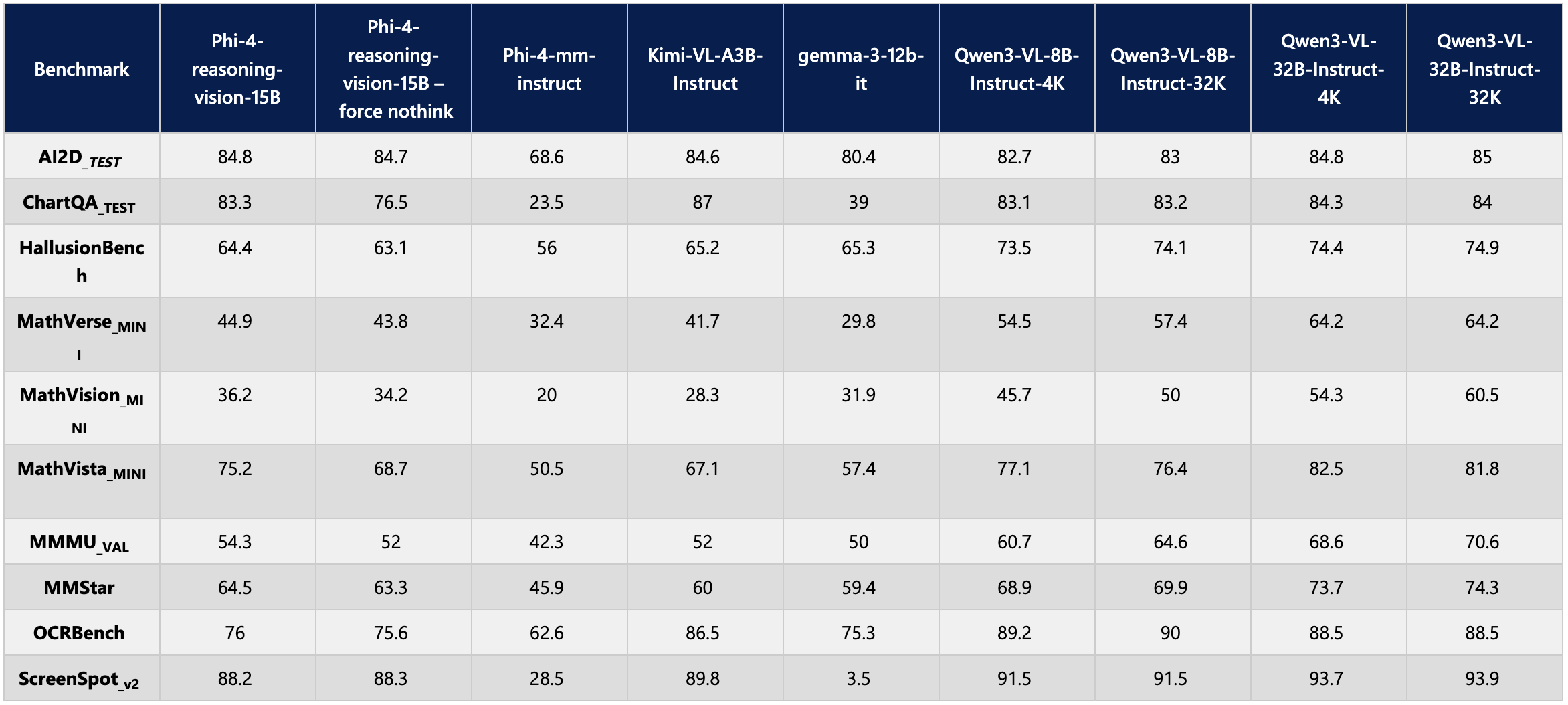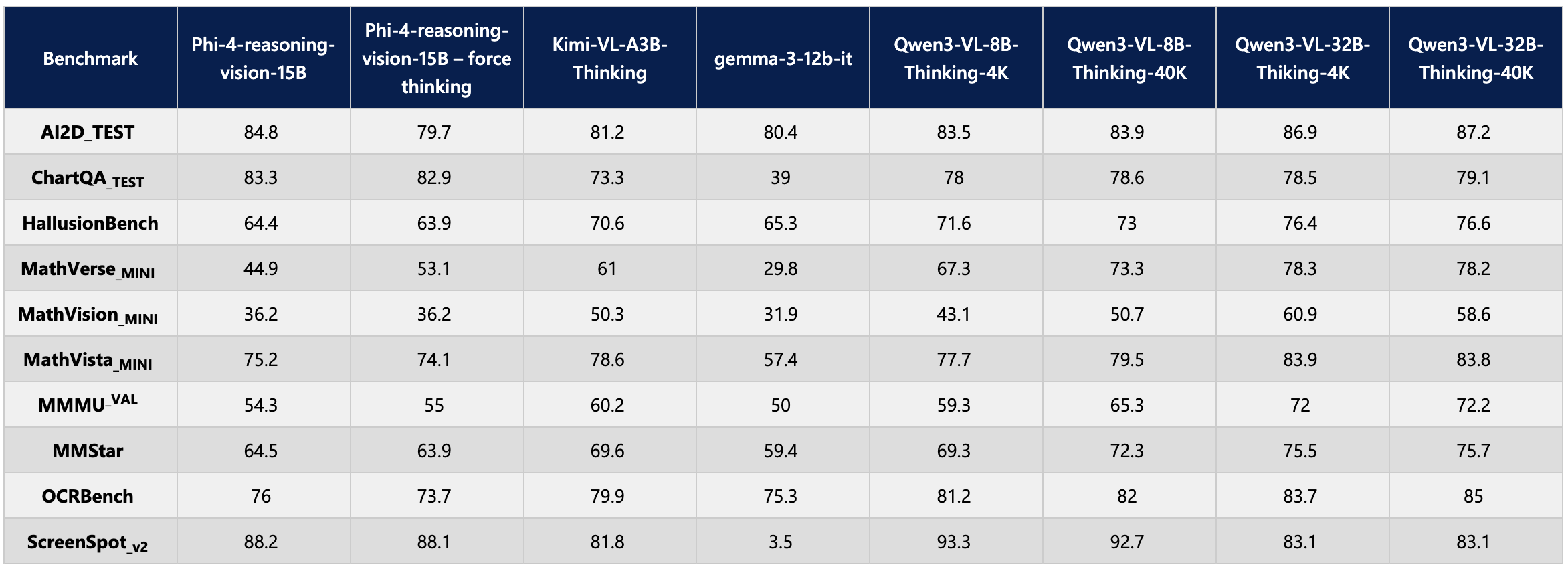 Microsoft, algoritmayı açık kaynaklı ölçütler (benchmark) kullanarak benzer büyüklükteki birkaç akıl yürütme modeliyle karşılaştırdı. Phi-4-reasoning-vision-15B, çok modlu matematik sorularından oluşan bir ölçüt olan MathVista_Mini'de Google'ın gemma-3-12b-it modelinden yüzde 17 daha yüksek puan aldı.