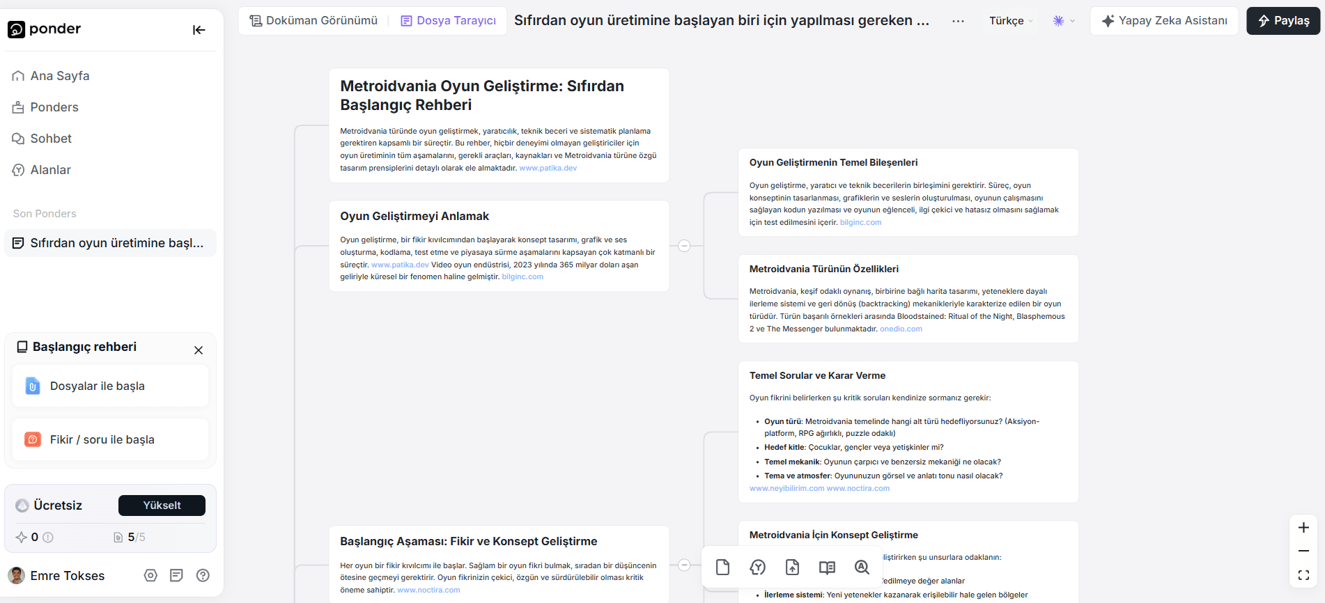 Ponder, farklı formatlardaki içeriklerle çalışmayı da destekliyor. PDF’ler, videolar, metinler ve web sayfaları doğrudan çalışma alanına aktarılabiliyor ve bu içerikler pasif kaynaklar olmaktan çıkıp düşünce sürecinin bir parçası haline geliyor. Platform, birden fazla kaynak arasında analiz ve karşılaştırma yaparak belgeler arasındaki anlamlı ilişkileri ortaya çıkarıyor ve daha derin içgörüler elde edilmesini sağlıyor.