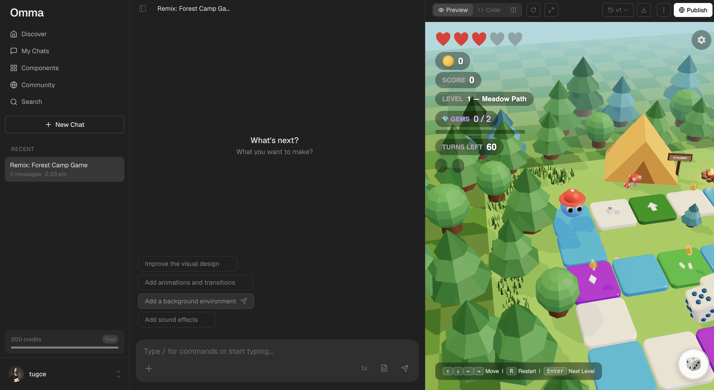 Mevcut araçlarda genellikle gördüğümüzün aksine Omma, 3D, hareket, animasyon ve kullanıcı arayüzünü görsel bir düzenleyiciyle tek bir doğal dil iş akışında birleştiriyor. Böylece platform, dakikalar içinde üretime hazır işlevsel, etkileşimli deneyimler üretiyor.