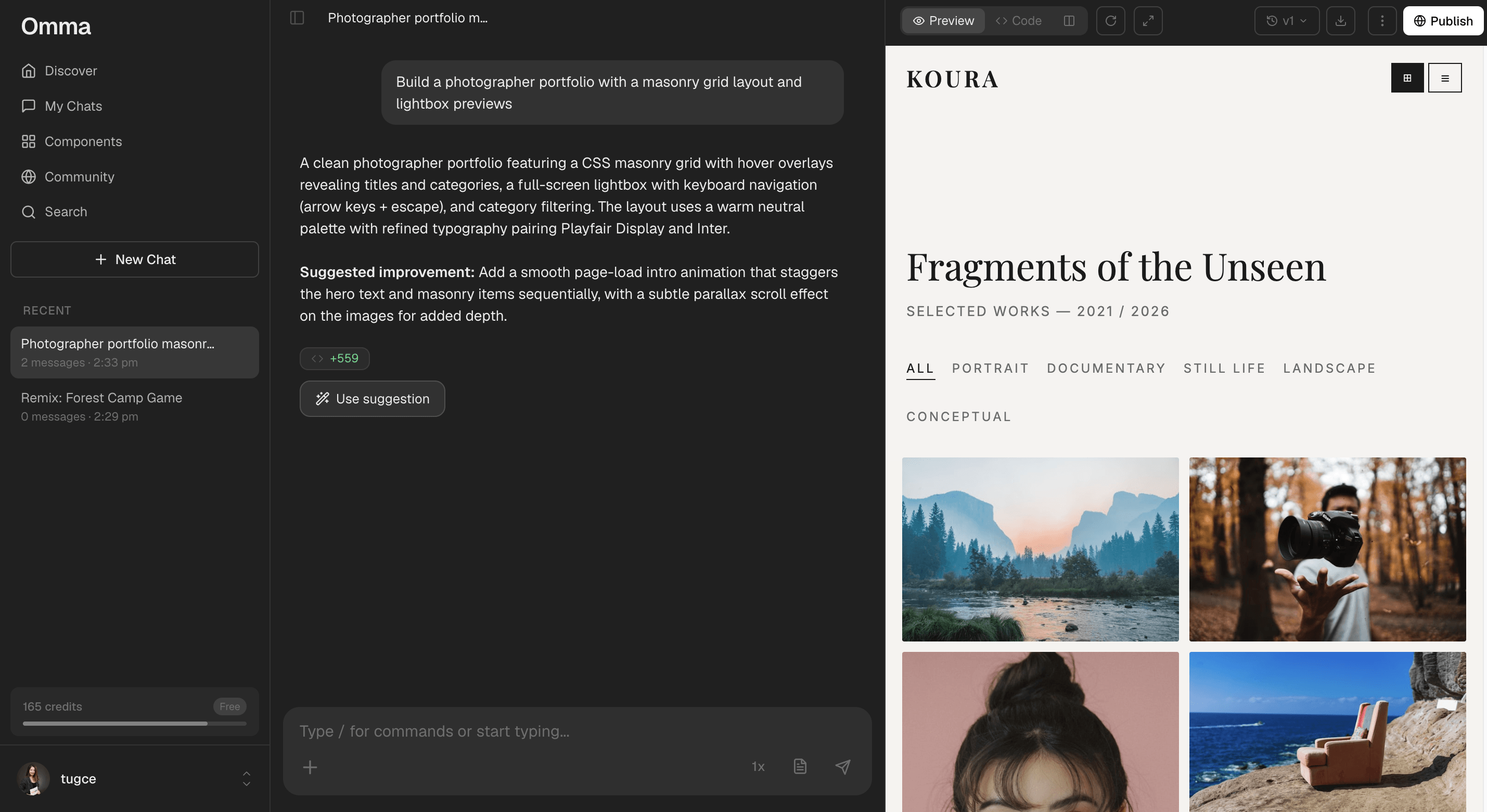 Omma'dan bir fotoğraf sanatçısının portfolyosunu sergileyebileceği bir web sitesi oluşturmasını talep ettiğimde, tasarımı hızlıca hayata geçiren Omma, aynı zamanda çeşitli öneriler de sundu. Tek bir tuşa basarak bu önerilerin hayata geçmesini sağlamak mümkün oldu.