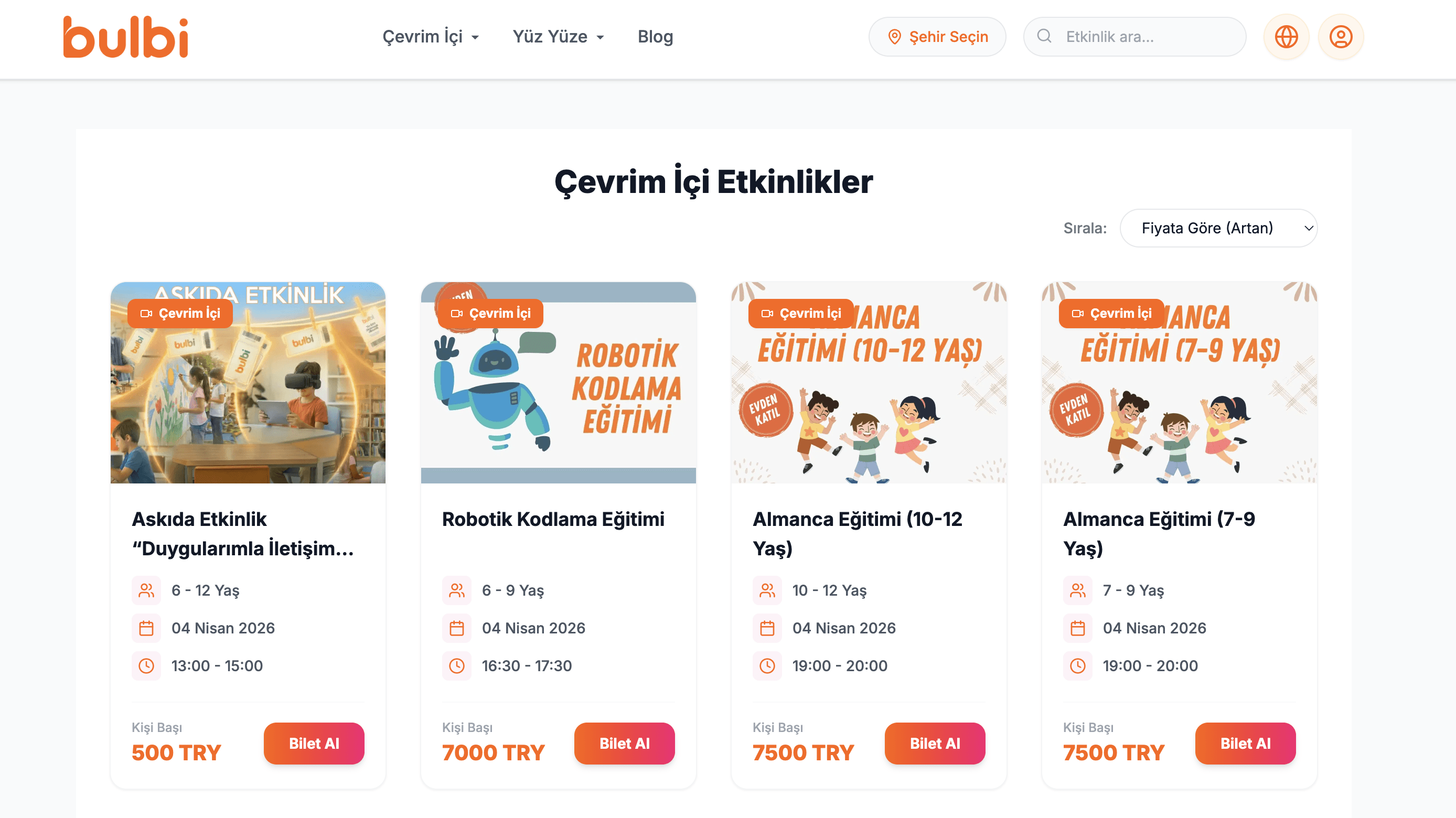 Platform, yüz yüze aktiviteler ve etkinlikler, online öğrenme ve ebeveynler için bir bilgi merkezi olmak üzere üç temel bileşeni bir araya getiriyor. Bulbi, yüz yüze aktiviteler ve etkinlikler kapsamında kullanıcıların yakınında bulabileceği etkinlikleri sunuyor. Bu etkinlikler arasında dans kursları, müzik dersleri açık hava etkinlikleri ve hikaye saatleri gibi kategoriler yer alıyor.