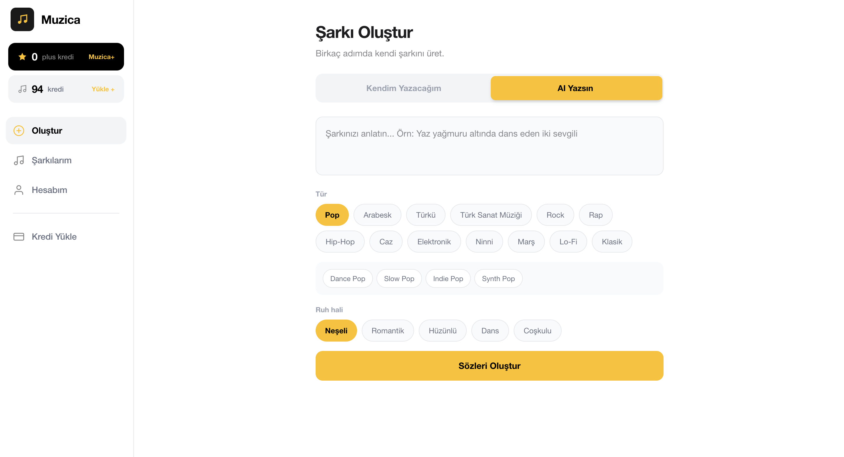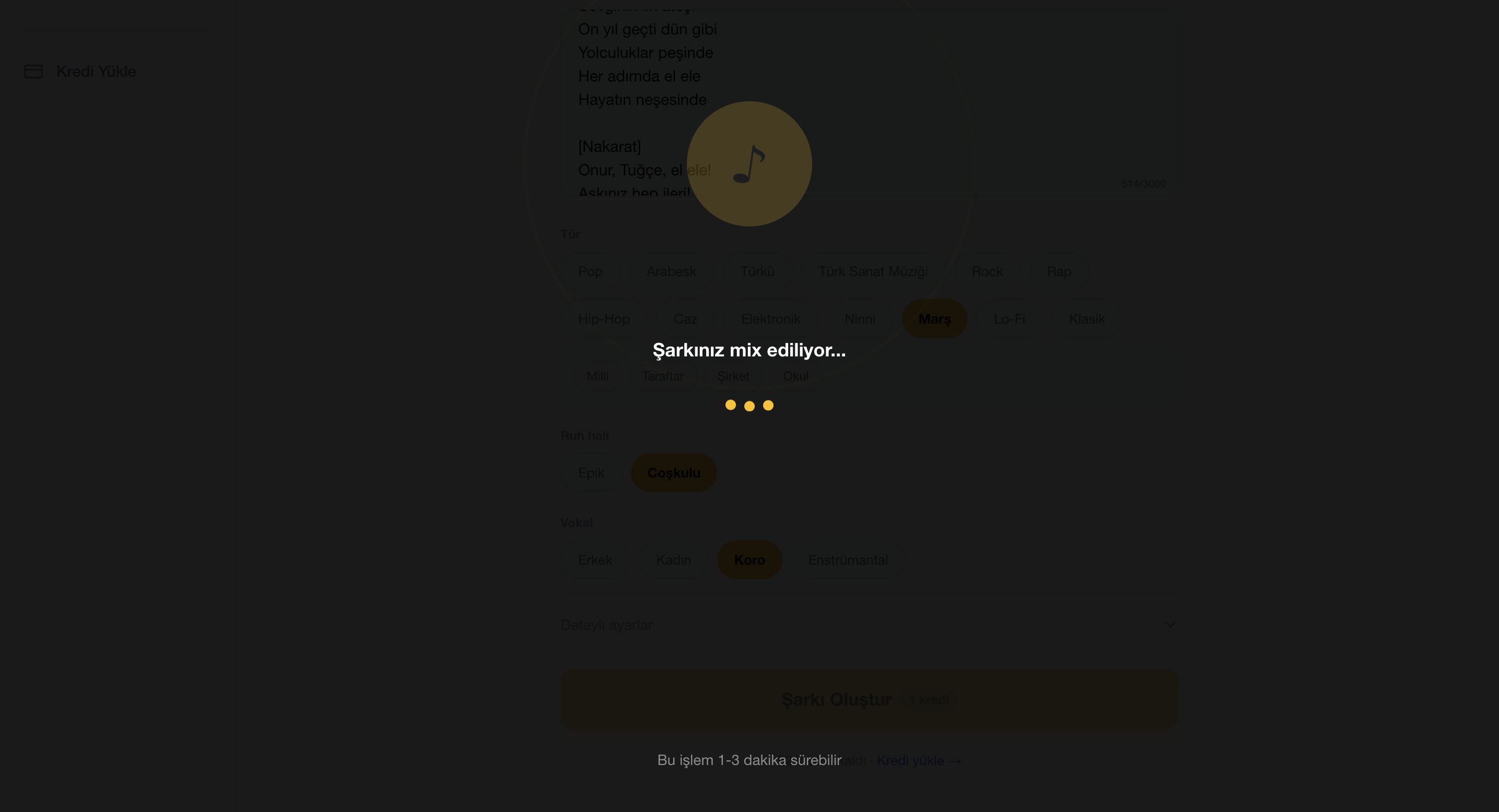 Platformda dilerseniz, şarkı sözlerini kendiniz oluşturabiliyor ya da komutlar aracılığıyla yapay zekadan destek alabiliyorsunuz. Tür seçimi, ruh hali ve vokal seçimini de tamamladıktan sonra şarkınızı oluşturmaya başlayabiliyorsunuz.