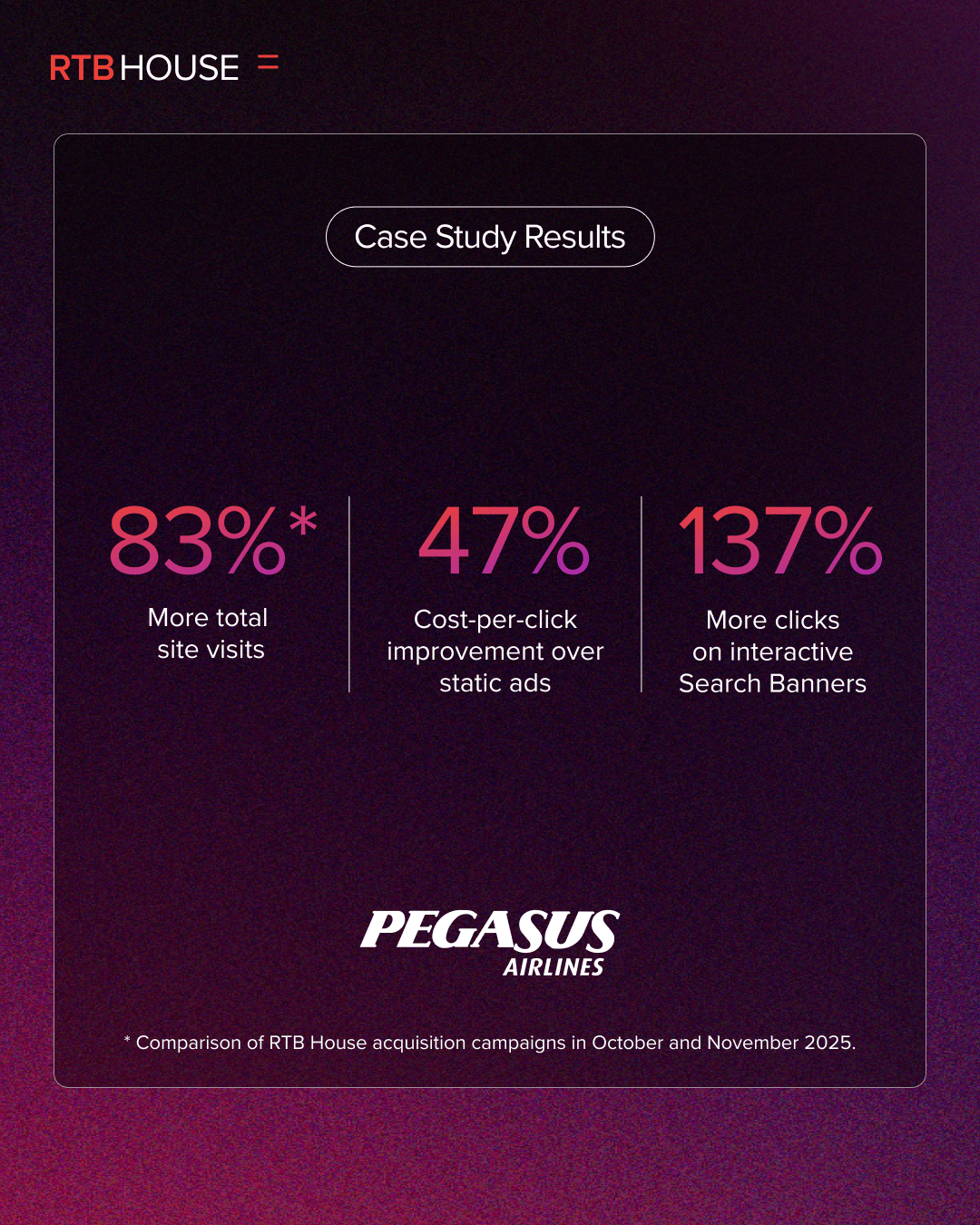 Kampanyanın başarısını değerlendiren Pegasus Hava Yolları Dijital Performans ve Büyüme Pazarlaması Lideri Dilek Güzel, şunları söyledi: "Almanya pazarında RTB House kampanyaları bizim için halihazırda etkili sonuçlar veriyordu ancak biz bu başarıyı daha da ölçeklendirmeyi hedefledik. Pegasus Hava Yolları olarak inovasyon ve verimliliğe odaklanıyoruz; bu noktada Arama Banner'ı çözümü hedeflerimizle kusursuz bir şekilde örtüştü. RTB House, ihtiyaçlarımızı anlama, yaratıcılık katma ve etkileyici bir maliyet verimliliğiyle yüksek kaliteli trafik sağlama konusundaki yeteneğini bir kez daha kanıtladı. Modern ve etkileşimli bir format olan bu banner'lar, müşterilerimizle her zamankinden daha fazla etkileşim kurdu ve ulaştığımız sonuçlar beklentilerimizin çok ötesine geçti."