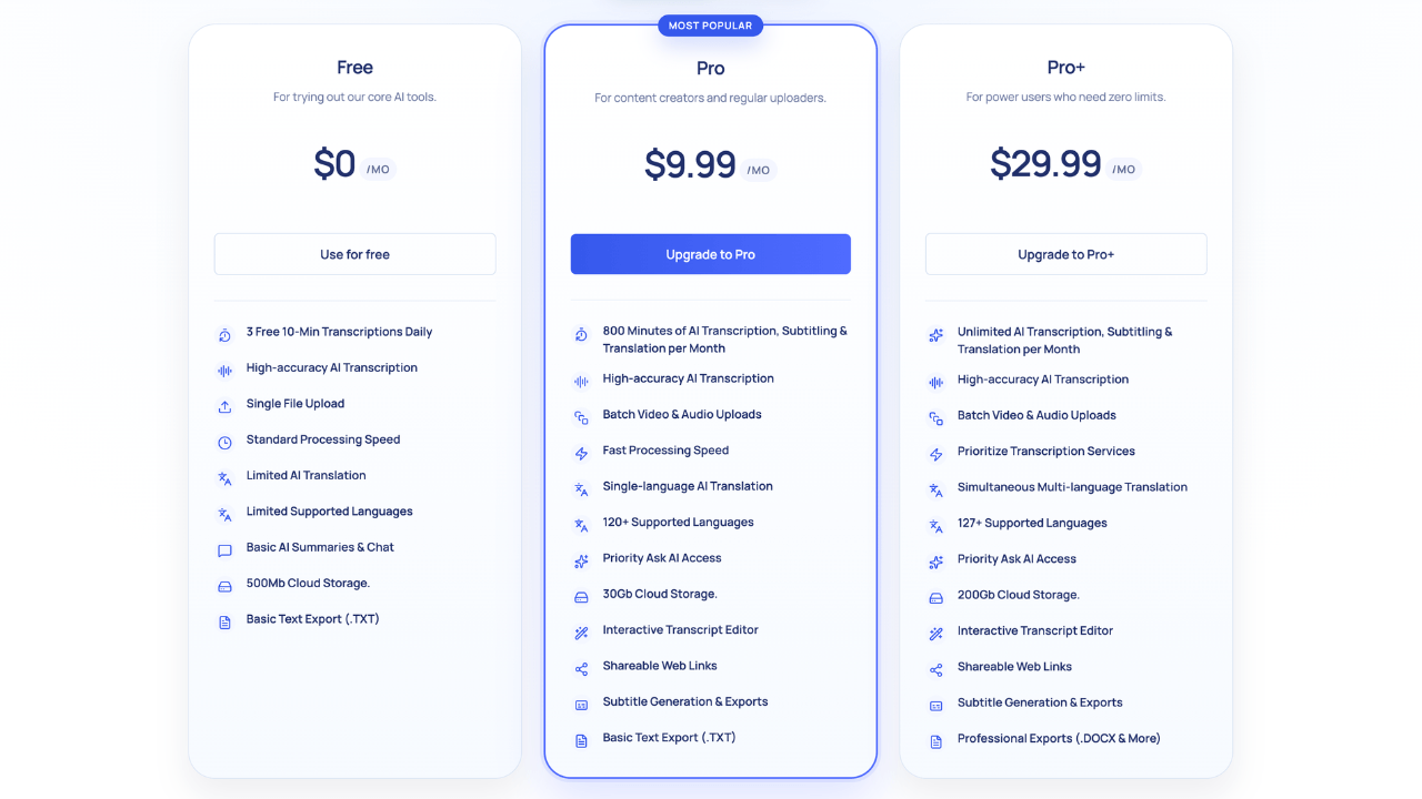 Fiyatlandırma tarafında EasyScribe, farklı kullanım ihtiyaçlarına göre esnek planlar sunuyor. Bazı temel transkript dakikaları ücretsiz olarak erişilebilirken daha yoğun kullanım ve gelişmiş özellikler için aylık 9.99 dolar ile 29.99 dolar arasında değişen ücretli planlar devreye giriyor. Bu yaklaşım, hem ara sıra içerik dönüştürme ihtiyacı duyan kullanıcılar hem de profesyonel içerik ekiplerinin ihtiyaçlarına göre ölçeklenebilir bir seçenek sunuyor.