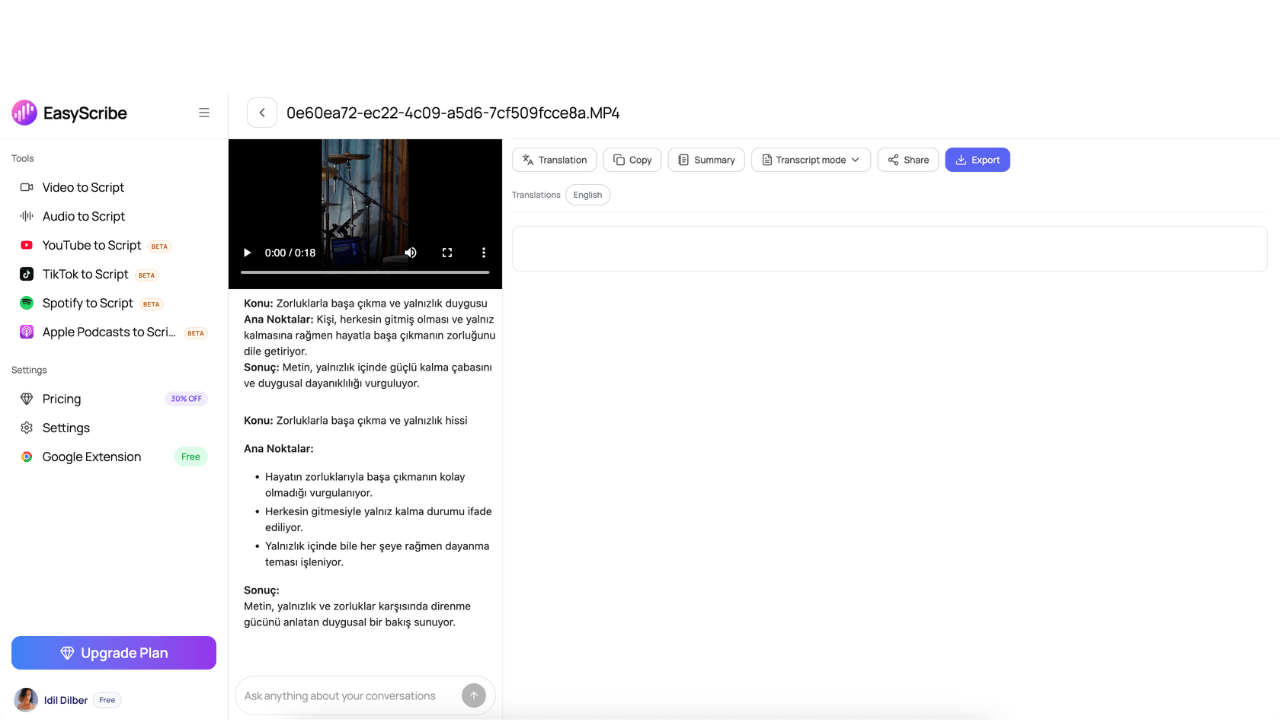 EasyScribe, farklı dosya formatlarını destekleyerek kullanıcıların esnek çalışmalarına olanak sağlıyor. Platform ses ve video içeriklerinin yanı sıra YouTube linkleri üzerinden de transkript üretme imkanı sunarak içerik üretim süreçlerini daha kapsayıcı hale getiriyor. Bu sayede kullanıcılar doğrudan web üzerinden buldukları videoları sisteme aktararak yazılı çıktılar elde edebiliyorlar. Ayrıca çıktıların dışa aktarılabilir olması içeriklerin blog, sosyal medya veya dökümantasyon gibi pek çok kanalda yeniden kullanılmasını kolaylaştırıyor.